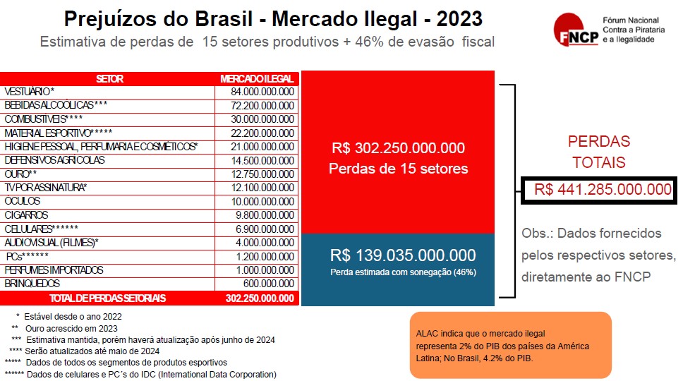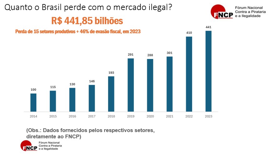 A comercialização de mercadoria contrabandeada, decorrente de todos os tipos de fraudes, é um problema de longa data no Brasil e vem crescendo ano após ano, fortalecida pelo aumento do poder de facções criminosas. Segundo os dados do Fórum Nacional Contra a Pirataria e a Ilegalidade (FNCP), em 2023, o País perdeu mais de R$ 441 bilhões. Os segmentos de vestuário (R$ 84 bilhões), bebidas alcoólicas (R$ 72 bilhões) e combustíveis (R$ 30 bilhões) foram as maiores vítimas desse tipo de crime. Esse montante representa 46% de evasão fiscal para o Brasil.
